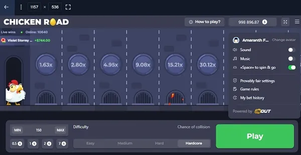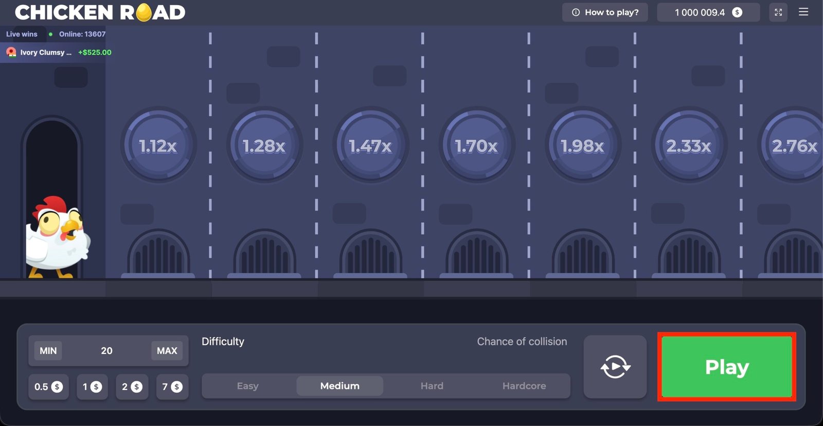 el juego tiene 24 casillas para que el pollo avance. Cada vez que lo hace, tiene que enfrentar una posibilidad del 4% de perder. La ganancia máxima es de tan solo x19,44.