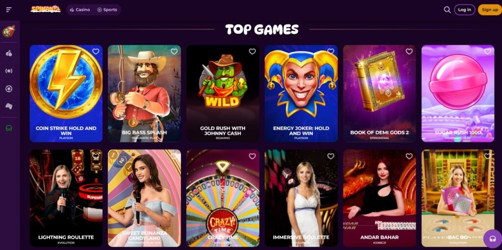Spinania ofrece más de 1000 slots, mini juegos diversos y un completo casino en vivo con juegos populares como Crazy Time y Majestic Wheelshow.